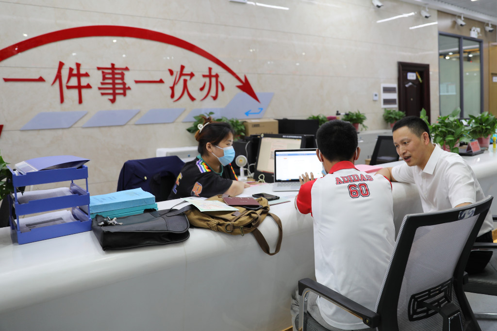 在政务服务中心,蒋炳炎实地查看了“放管服”改革工作推进情况,与办事居民亲切交流。