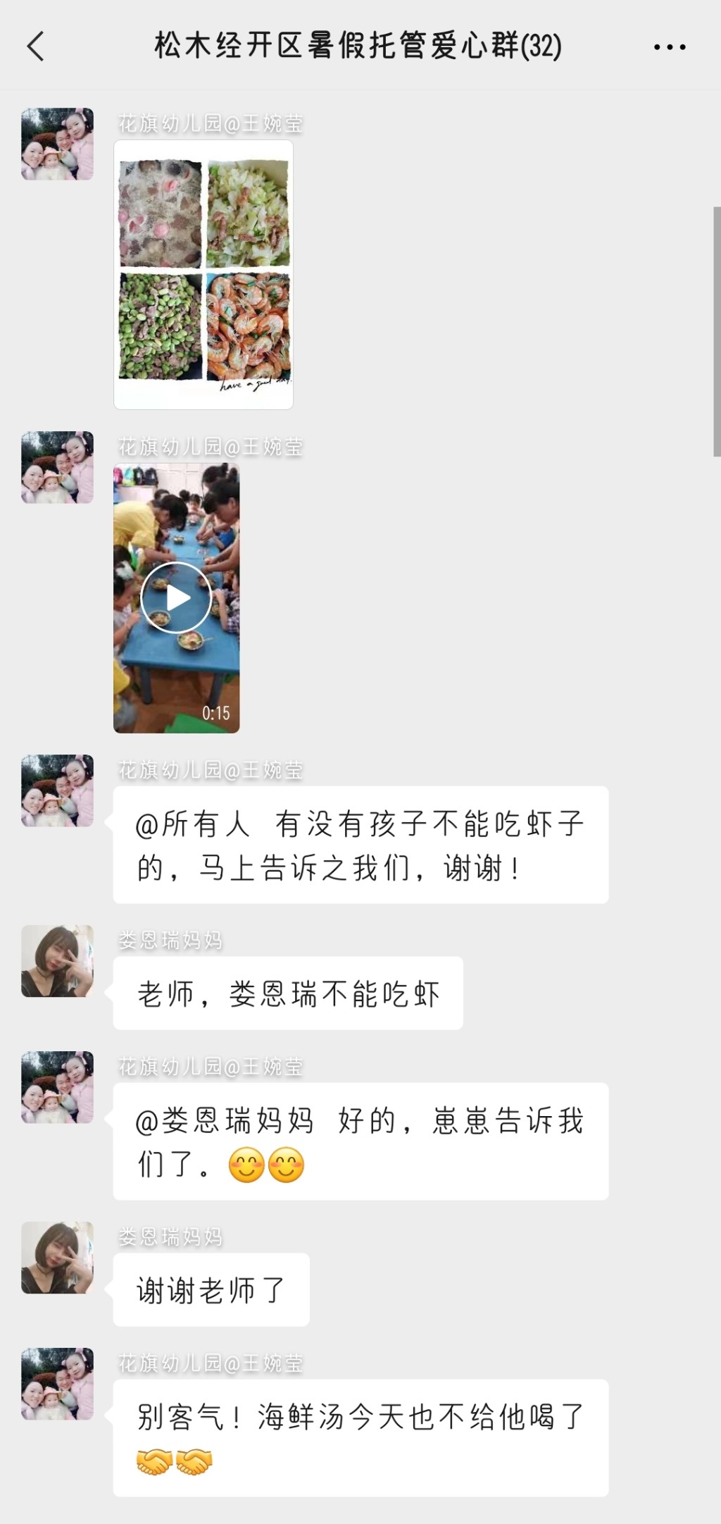 “有没有孩子不能吃虾子的?马上告诉我们,谢谢!”“老师,娄恩瑞不能吃虾。”“好的,崽崽告诉我们了。海鲜汤也不给他喝了。”在“松木经开区暑期托管爱心群”,托管班老师以微信群为沟通平台,及时了解托管孩子的个人情况,并通过发送静态照片和动态视频,让各位家长及时掌握自家萌娃的托管情况。