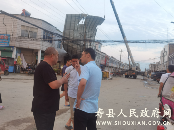 保义镇开荒街道一块大的彩钢瓦刮到电线上,导致开荒片停电。保义镇镇长余守全到受灾现场指挥,调来吊车将其隐患清除,并安排镇供电所全力抢修电路保障群众用电。