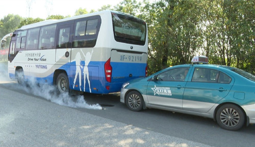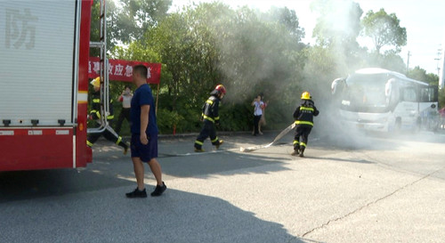 演练模拟一辆客运车辆行驶至临湘大道民政局对面路段时被一辆出租车追尾引发火灾,造成出租车内两名乘客受伤。事故发生后,客车驾驶员先组织紧急抢救伤员,再将客车内乘客转移至安全地带等待应急车辆转运,随后向公司负责人报告事故情况,并拨打救援电话。