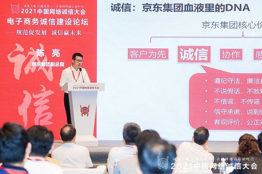 7月15日,2021年中国网络诚信大会·电子商务诚信建设分论坛于湖南省长沙市举办,京东集团副总裁陈亮以“澎湃向善力量 坚守诚信高地”为题发表主题演讲。