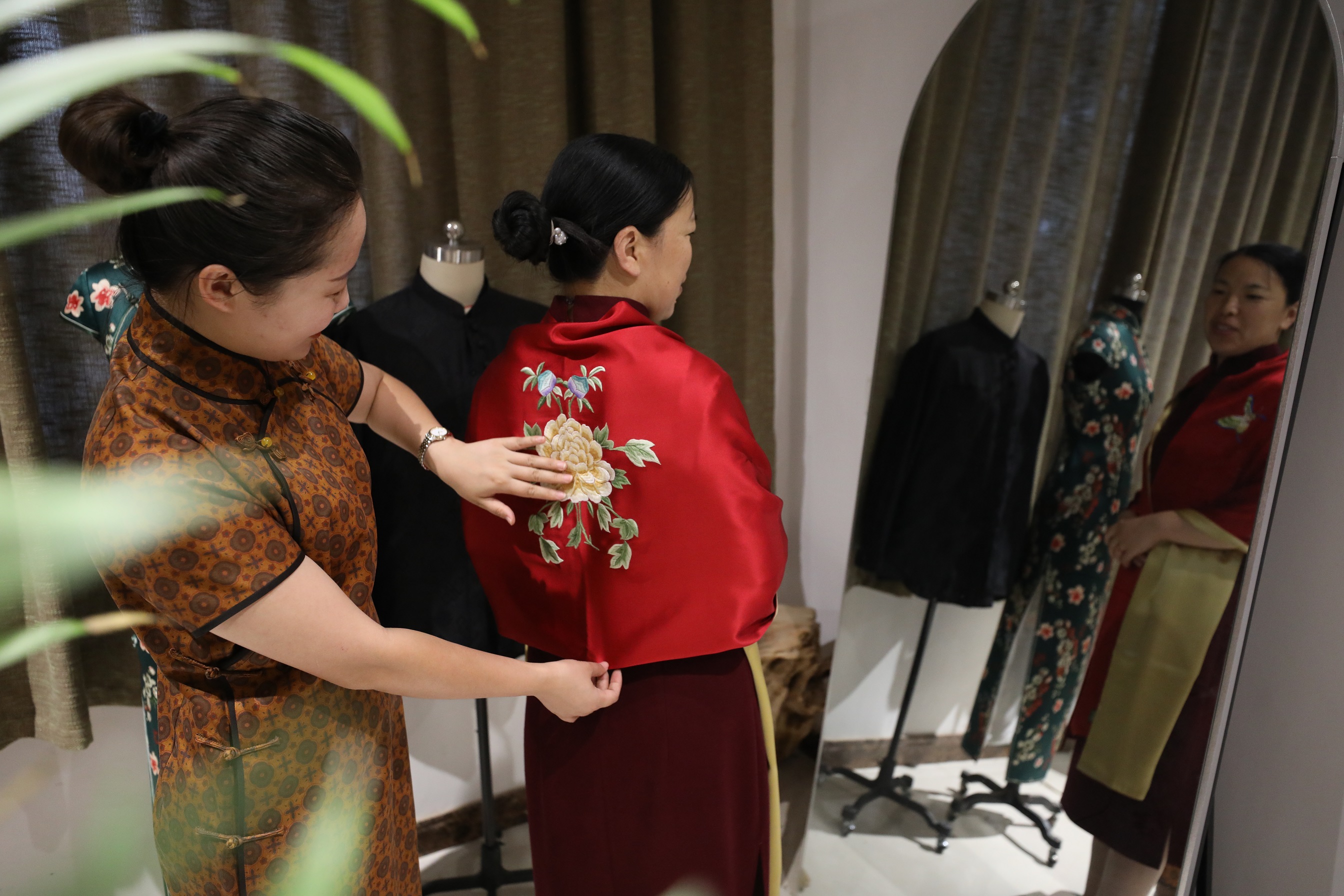 ? 7月18日,在隆尧县北楼乡一家服装企业,工作人员在试穿京绣披肩。