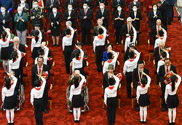 6月29日,庆祝中国共产党成立100周年“七一勋章”颁授仪式在北京人民大会堂金色大厅隆重举行。这是少先队员向勋章获得者献花,敬礼致意。新华社记者 高洁摄