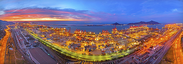 2019年9月26日夜晚,江苏省连云港主港区灯火通明,码头工人在自己的岗位上装卸作业。王健民摄