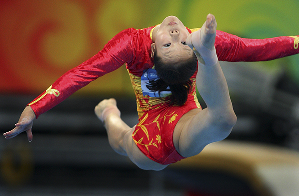 2008年8月13日,中国选手程菲在国家体育馆进行的北京奥运会体操女子团体决赛中进行自由体操比赛。当日,中国队以188.900分的成绩夺得团体冠军。林慧摄
