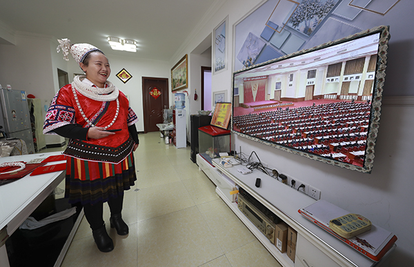 2020年10月30日,贵州省凯里市上马石社区,建档立卡户李佑英在政府分配的新房内收看电视节目。目前,李佑英在致富带头人杨美创办的扶贫车间里任车间主任,通过技术帮扶带动群众共同致富。光明日报“56个民族一起奔小康”主题采访报道组拍摄
