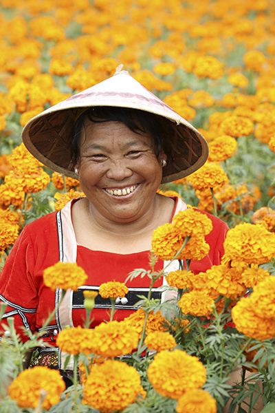 2020年8月20日,云南省腾冲市水乡三家村中寨村民花进仙地里采摘万寿菊。去年以来,三家村根据当地旅游特色开始引导村民大规模种植万寿菊,打造新的旅游景观,促进农民增收。光明日报“56个民族一起奔小康”主题采访报道组拍摄