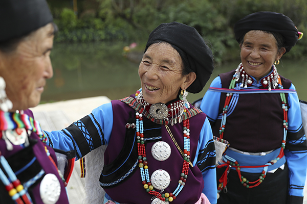 2020年8月29日,66岁的和家凤老人(中)和同伴们身穿盛装在县城准备参加当晚的歌舞比赛。光明日报“56个民族一起奔小康”主题采访报道组拍摄