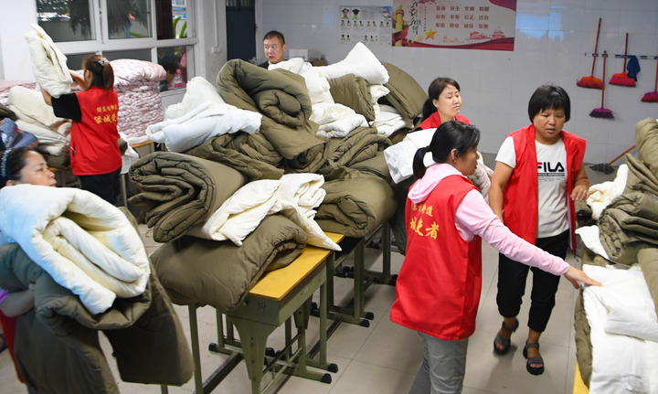 7月21日,在郑州市电子信息工程学校集中安置点,志愿者在整理被褥。