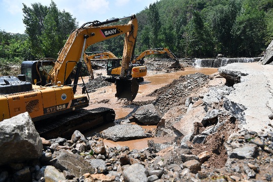 近日,地处太行山区的河南省鹤壁市淇县黄洞乡遭遇强降水,引发山洪导致黄洞乡境内的鱼大线公路被冲毁,2个行政村200多名群众被困山上。当地政府紧急调配大型机械抢修道路。