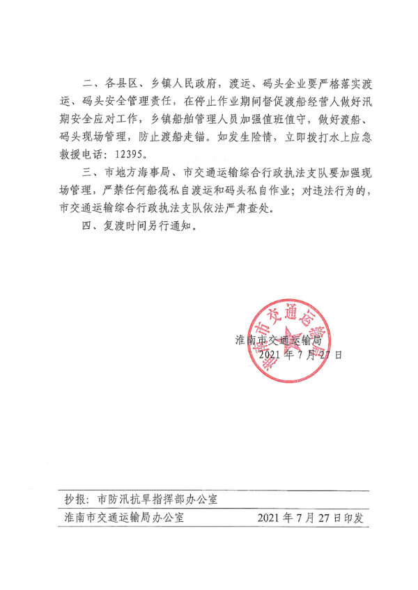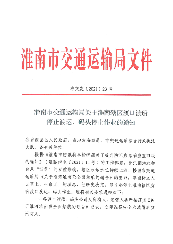 淮南市交通运输局关于淮南辖区渡口渡船停止渡运、码头停止作业的通知