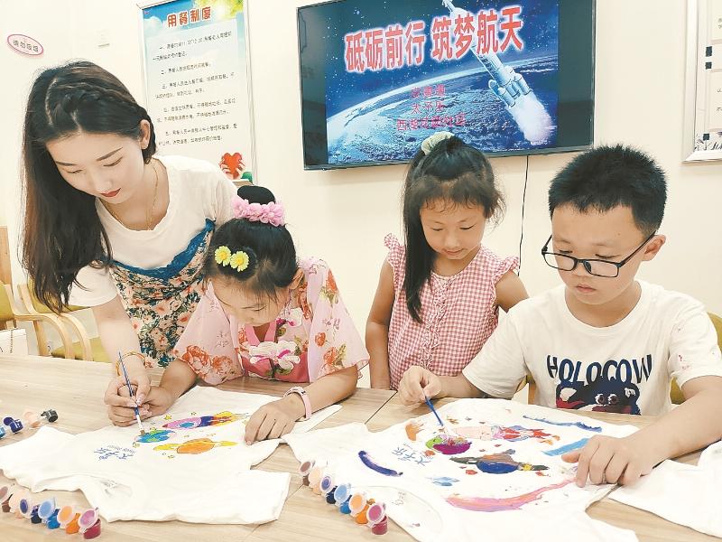 孩子们发挥自己的想象力,在白T恤上作画,“胖胖”的火箭、“带着笑容”的飞船,还有和星星们做伴的空间站……孩子们用自己的方式走近太空、爱上太空。