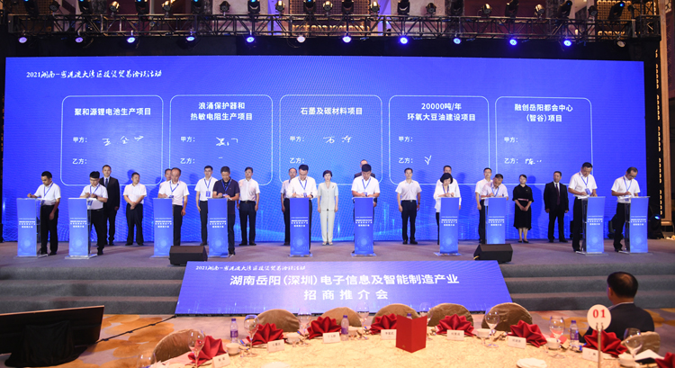 会上,市工信局、临湘市、汨罗市、城陵矶新港区分别作了产业推介。会议还进行了四轮签约。中集集团集装箱控股有限公司与市政府签署了战略合作协议,汨罗光电子产业园等15个项目成功签约。