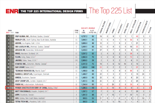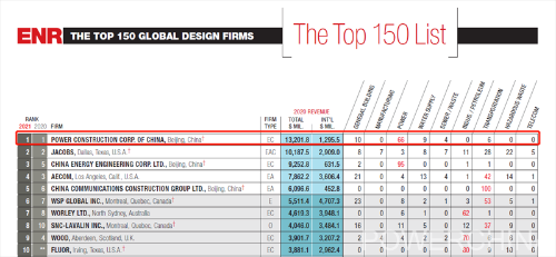 中国电建在最新ENR全球设计企业排名中继续保持第一
