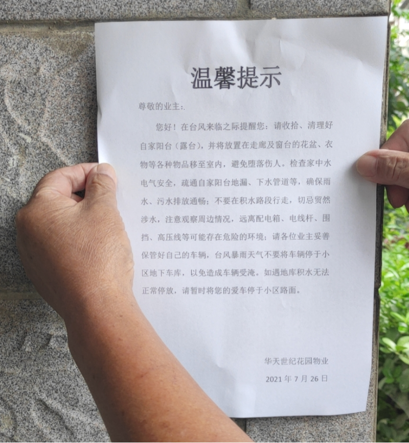 要求各物业企业制定紧急预案,加强防台风防汛宣传教育,在易积水区域贴上醒目通知,在小区各单元张贴明白书,利用业主群、电子屏等方式告知台风天气及汛期注意事项,提高业主防范意识,提前做好准备,防患未然。