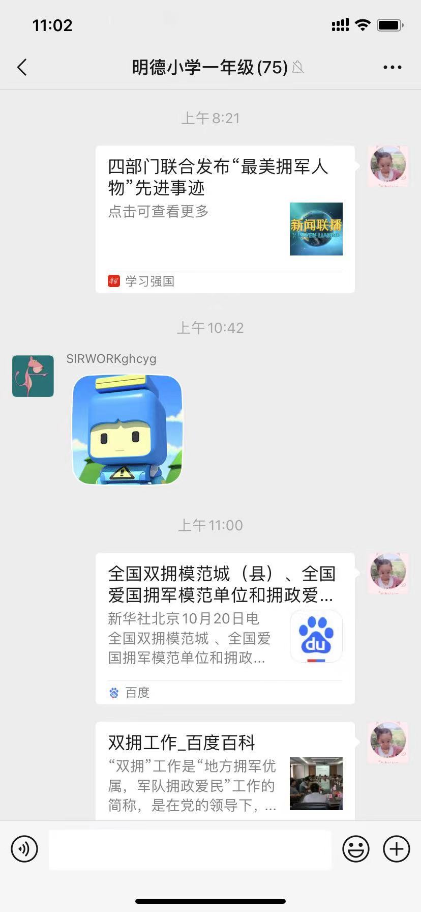 “八一”建军节即将来临,为了使双拥工作再上一个新台阶,仲兴乡明德小学组织各班班主任通过家长群大力宣传双拥工作。
