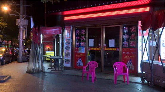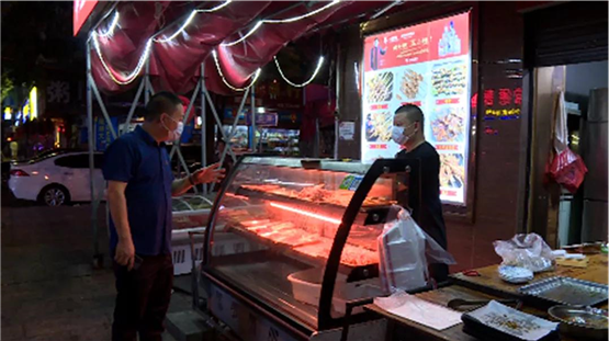 21时30分,在永兴路,这条以往繁华热闹的“夜宵一条街”,几乎空无一人,执法人员挨家挨户巡查,查看烧烤、夜宵门店是否按照规定在疫情防控期间关闭到位。