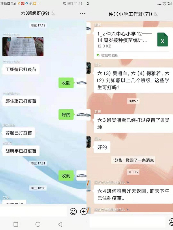 仲兴中心小学校长王占雷一接到上级通知,就立刻组织老师对2009年7月31日前出生的学生进行摸排。由于此年龄阶段的学生大多数是六年级已毕业的学生,毕业学生的家长群有的已解散,这给工作带来一定的难度。原毕业班的老师们重新组建家长群,通知疫苗接种事宜,对没有加入的学生家长,一一打电话告知,并时刻上报学生接种疫苗的情况。