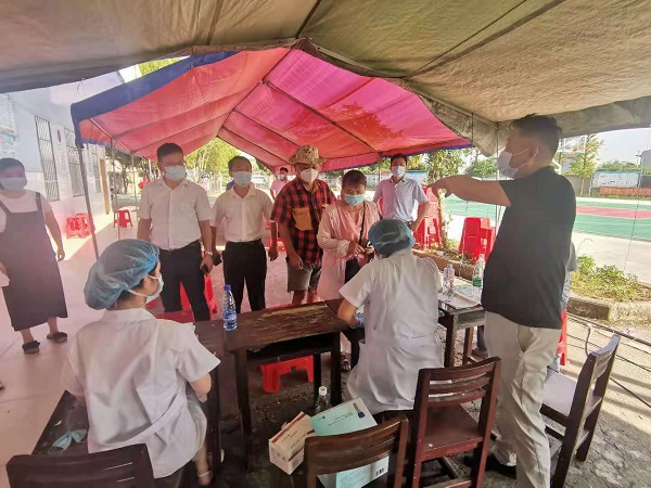 【争分夺秒阻病毒】东方欲晓,程曦初露,刘斌村驻村领导干部、村干部、网格员就开启了忙碌的一天,为了确保村民一来就可快速登记采样。市商务局派驻村工作队长赵友松,梁子镇党委委员、刘斌村驻村领导干部余彩云、村书记刘国文带领大家到刘斌小学将采样室、口罩、消毒水、遮阳棚、电扇、桌椅板凳、饮用水等相关物资、事宜筹备妥当,提前做好核酸检测服务保障工作。