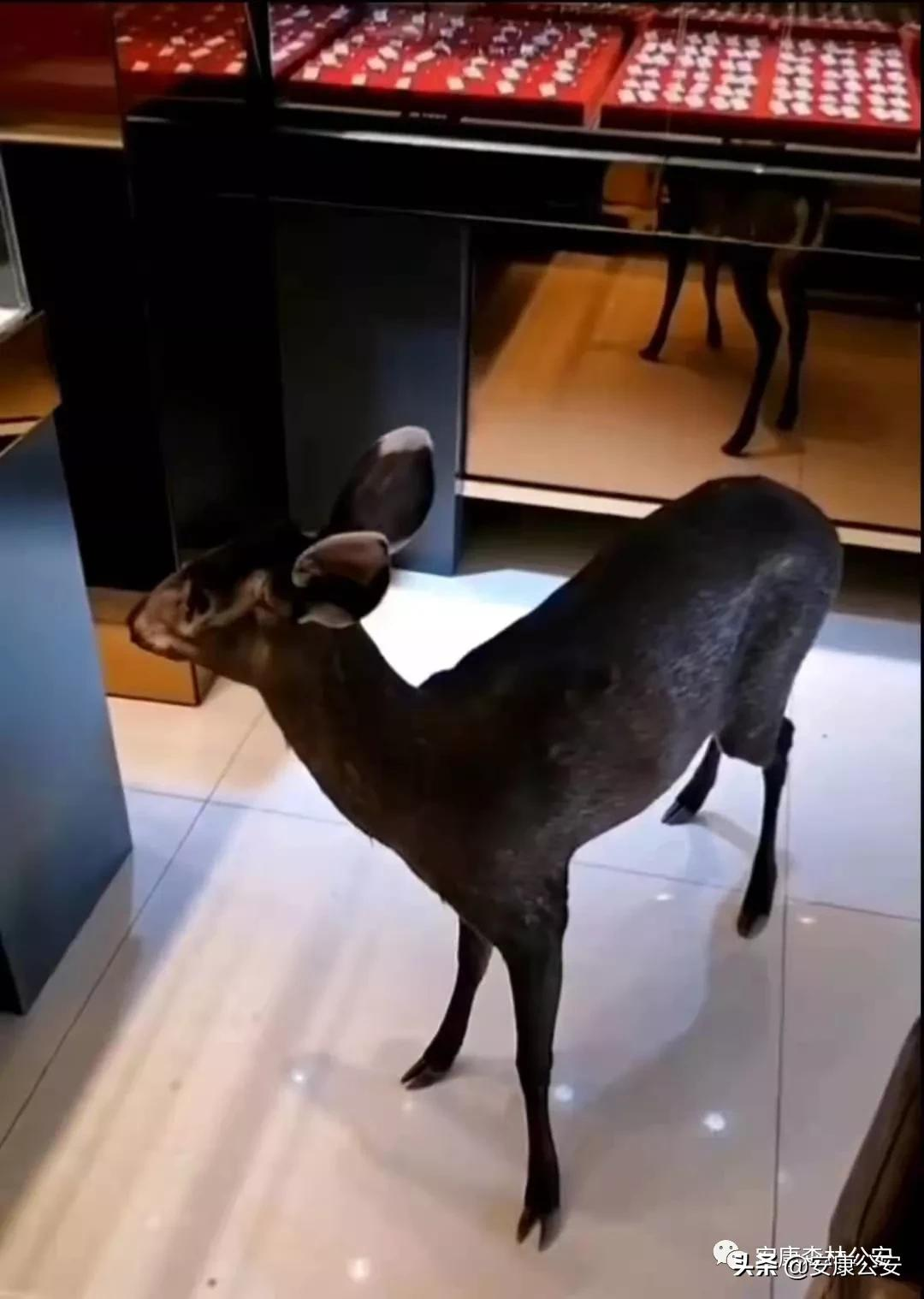 民警赶到现场,该动物正在一家金店内饶有雅兴地欣赏眼前场景,据悉此动物为青麂(又名毛冠鹿),属国家二级保护动物。在此之前它已经闯入一家宾馆,在宾馆里的楼道来回溜达,踢坏了楼道的玻璃,随后进入金店继续逛街。民警立即开展捕获并对其进行救助随后放生。