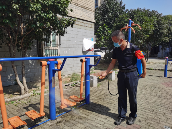 志愿者对小区健身器材等公共区域进行重点消杀