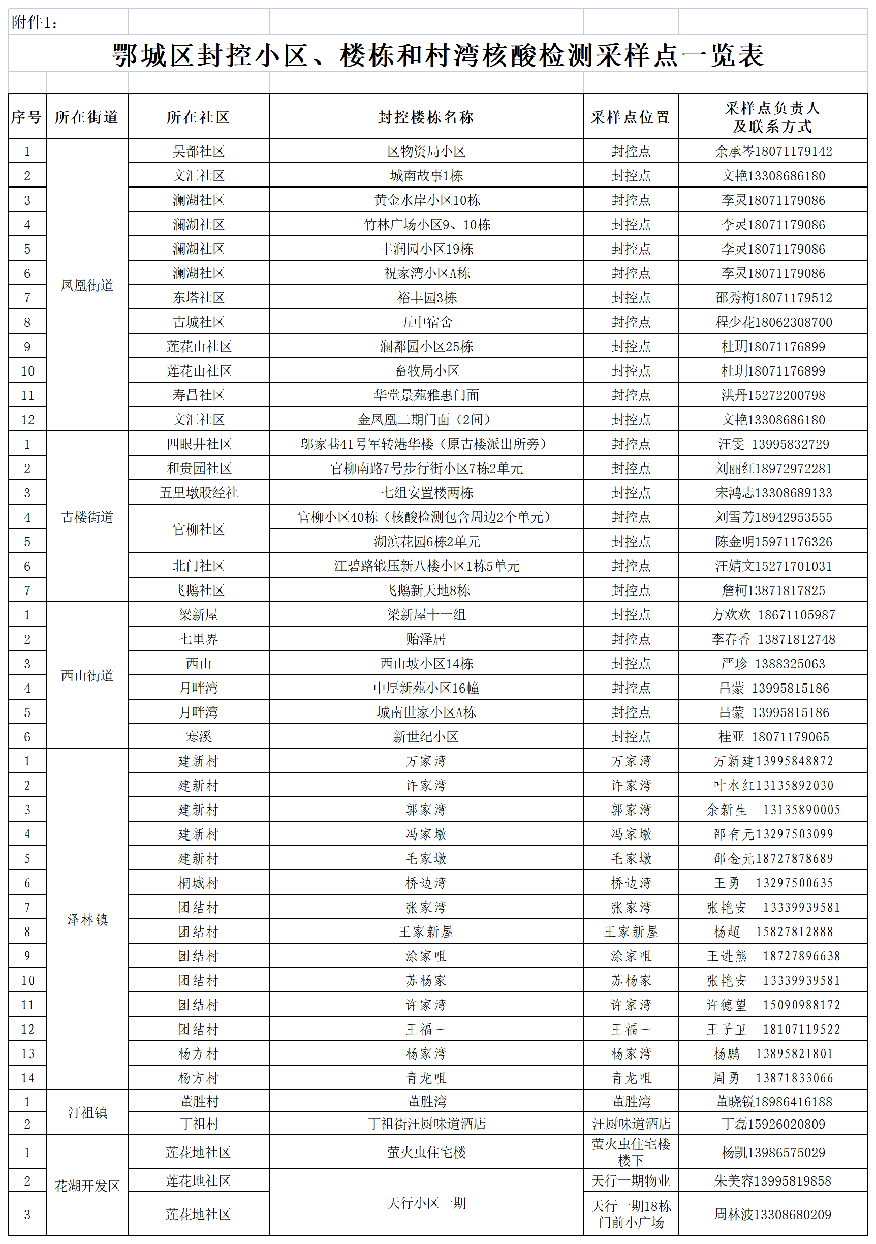 一、采样时间及范围 2021年8月11日,有针对性地完成全区已封控小区、楼栋和村湾所有居民第二轮全员核酸检测任务。 二、检测方式 按照5:1混样检测执行。 三、采样地点 各镇、街道、开发区规范设置在封控区域内的采样点。 四、注意事项 1.封控区域内居民根据所在社区(村)、小区、单位的通知,携带身份证等有效证明,有序到指定地点开展采样。 2.如有接种新冠疫苗的,请于接种后24小时后再进行核酸采样。 3.检测时,请封控区域内居民注意全程严格规范佩戴口罩,严格与他人保持1米以上间隔,不交谈、不扎堆,严格按照现场工作人员指引,有序完成测温、扫码、登记、采样等工作流程,严防人员聚集带来交叉感染。 为了全力维护全区人民安康,请封控区域居民积极配合,共同顺利完成核酸检测任务。衷心感谢居民朋友的理解与支持! 附:鄂城区封控小区、楼栋和村湾核酸检测采样点一览表 鄂城区疫情防控指挥部 2021年8月10日