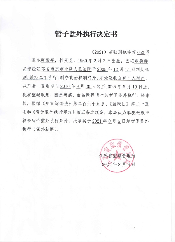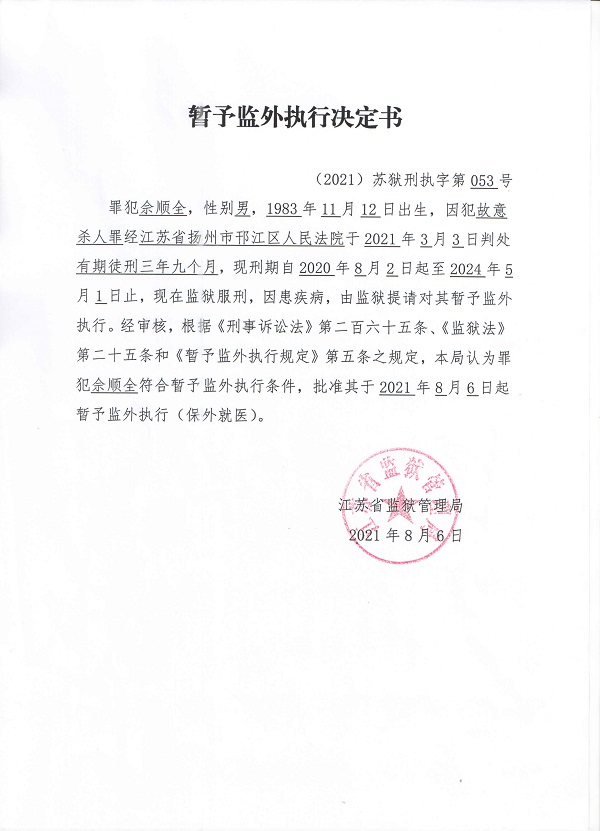 暂予监外执行决定书(2021)苏狱刑执字第052-053号