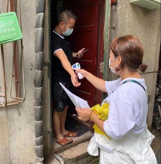 戴浩的妻子陆慧娟在上门为居民监测体温