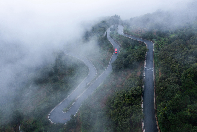 8月17日,公交车从海拔800米的诸暨市赵家镇桃岭村前往山下的镇区(无人机照片)。