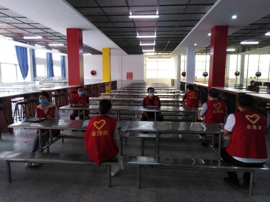 学生进入食堂就餐前,排队先检测体温正常,然后到洗手池进行清洁消毒,间隔一米排队等候打餐,在餐桌斜对面保持一米距离就餐。学生到宿舍就寝前,防控人员会对每一个学生再进行体温检测,体温正常才能进入寝室,就寝时保持安全就寝距离。