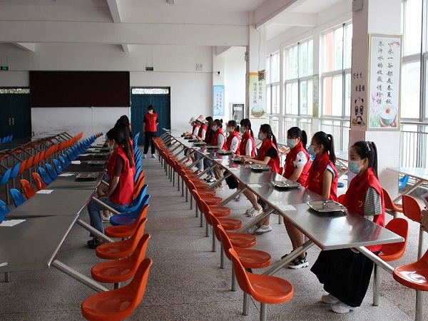食堂就餐演练环节模拟了师生就餐时的情景,间隔一米有序排队取餐,就餐时一人一桌同向用餐。