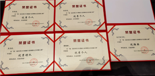 近日,由国家卫生健康委规划发展与信息化司主办,中国医院协会信息专业委员会承办的第二届全国卫生健康行业网络安全技能大赛经过线上初赛、线下决赛,来自全国医疗战线的988 支赛队中86 支赛队获得了奖项。我院辛均益主任(副书记、副院长)带领学院老师董静静及19级医学信息工程专业吴佳溢、徐恒诺同学荣获团队优胜奖及优秀领队、优秀个人荣誉称号。这是我校首次参与网络安全技能大赛并获奖。