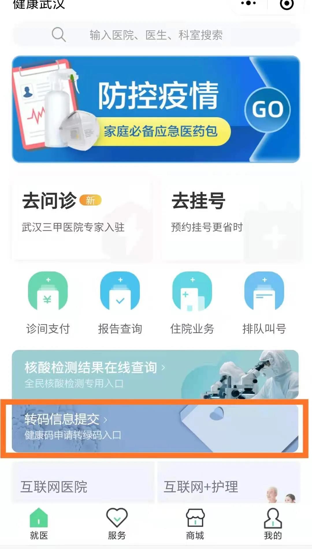 第一步:微信小程序搜索“健康武汉”,识别进入主页面,找到“转码信息提交”,点击进入健康码申请转绿码入口。