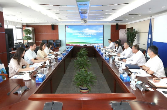 晏志勇对潘绮瑞大使到访中国电建表示欢迎,感谢以驻华使馆长期以来对中国电建在以色列市场的经营和发展给予的大力支持和帮助。晏志勇介绍了中国电建的全产业链优势及核心业务领域,追溯了公司“为水而生,为电而聚”的发展历程。他表示,中国电建在“风光水储”领域、输电系统和火电领域方面有领先技术实力和经验,非常愿意与以色列在利用风光水储一体化,提高风光电的有效利用,保障电站安全可靠运行方面加强合作和分享,共同应对全球气候变化和实现“碳达峰碳中和”目标。