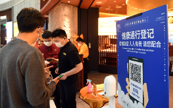 8月29日,郑州市一家餐厅的工作人员引导顾客扫码入店。
