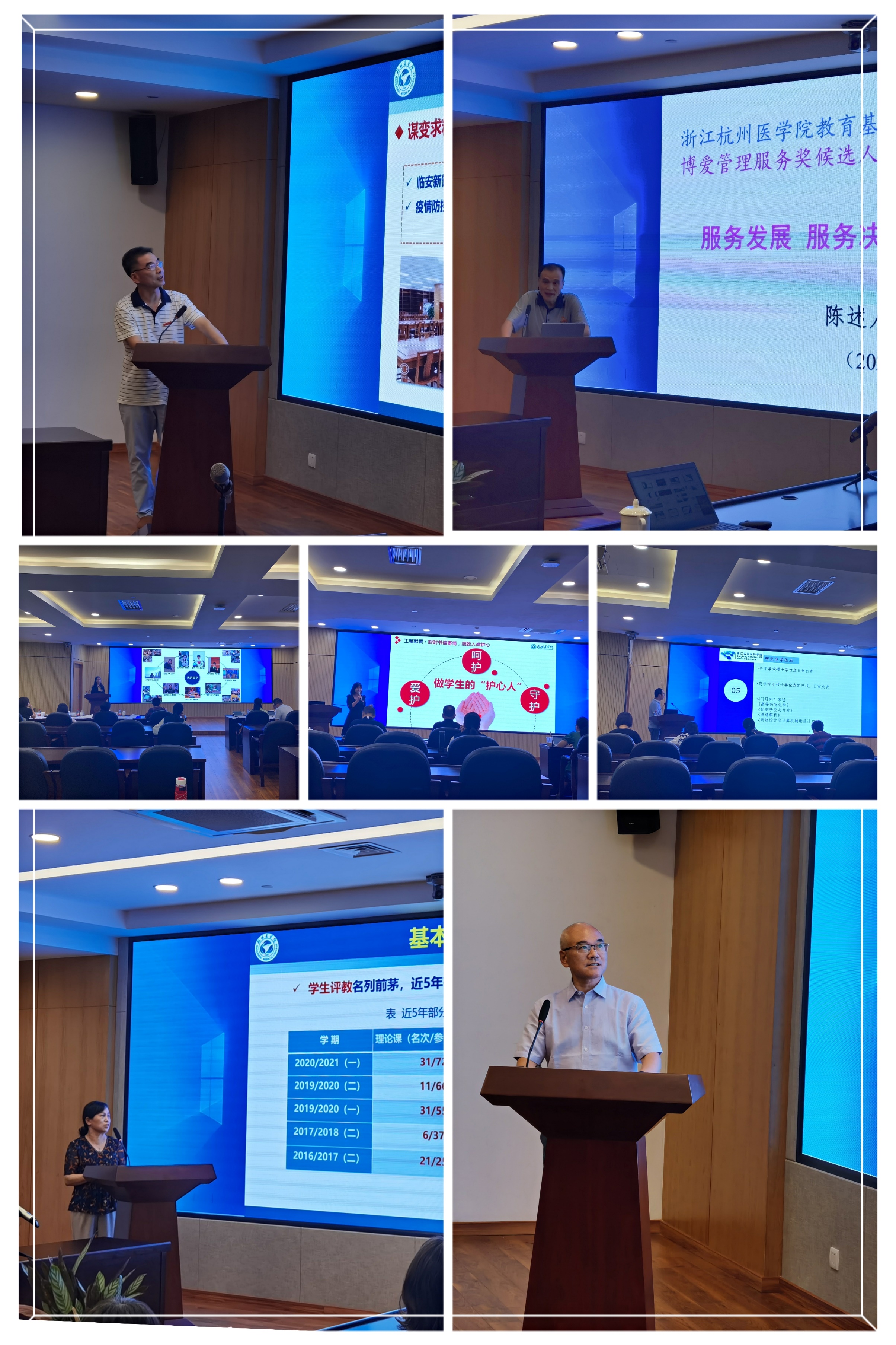 为进一步激发杭州医学院一线教职员工的工作热情,树立爱岗敬业标兵,表彰功底扎实、业务精湛、勤奋努力、业绩突出的优秀教职员工,学校于6月底启动了首届博爱奖评选工作。8月19日,学校首届博爱奖专项评审会在临安校区图书馆606会议室和4楼国际会议厅分别举行。各专项评审组专家分别对博爱潜心教学奖、博爱全心育人奖、博爱管理服务奖、博爱最佳新秀奖四个奖项的34位预备候选人进行现场评议。