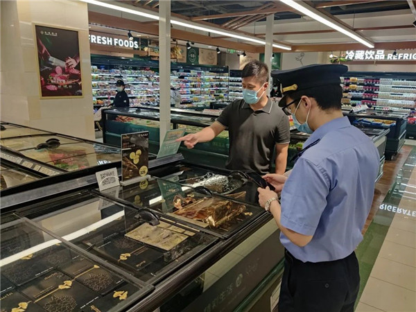 在万柳华联商场内,检查组对超市生鲜区的冷链产品管理进行检查,现场察看是否落实追溯二维码、单独摆放等冷链管理措施,确保做到冷链食品全链条、全流程、全覆盖监管。 随后,检查组对餐饮企业针对前期检查发现的问题进行复查巩固,确保问题无复发,严格按照要求落实。同时,要求经营者随时督促顾客佩戴好口罩,做好疫情防控各项措施。