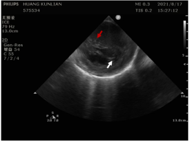 红色箭头处为左后乳头肌,白色箭头处为左前乳头肌