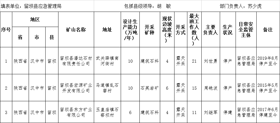 汉中市留坝县露天矿山有关情况公示清单