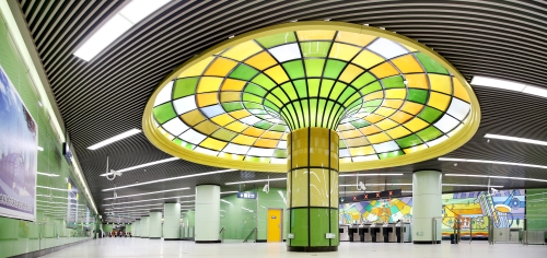 哈尔滨素有“东方小巴黎”、“东方莫斯科”之美誉。地铁2号线一期工程车站建筑装修采用欧式风格,划分为重点车站、廉政主题车站、标准车站三种类型。标准站在设计上提取欧式元素中的网格、线角重新排列组合,融合在地铁车站的墙面、地面、天花中,在灯具表面附加欧式建筑特有的符号进行点缀,呈现现代化设计中的古典美观。重点车站在设计上结合地域文化和周边环境,提取元素进行重组,选取特殊材料及造型,进行重点展现。
