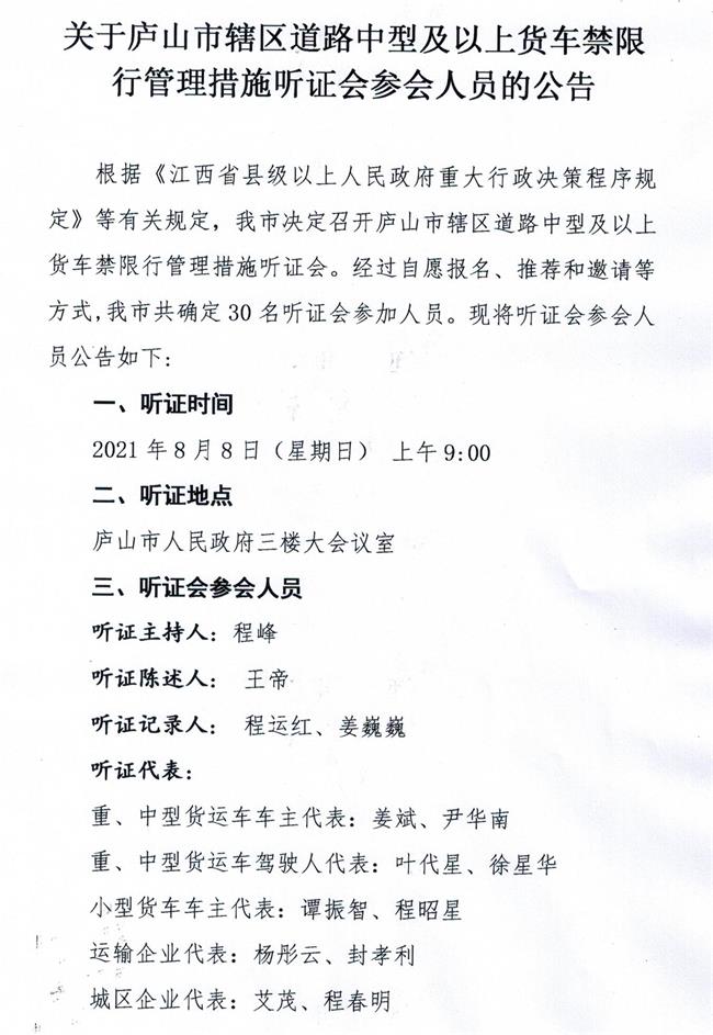 关于庐山市辖区道路中型及以上货车禁限行管理措施听证会参会人员的公告
