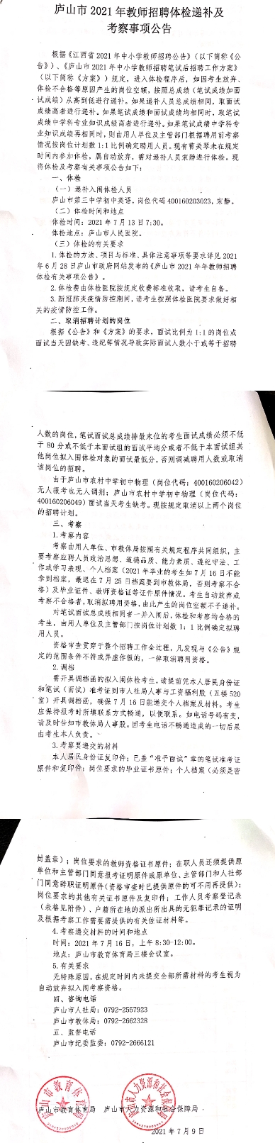 庐山市2021年教师招聘体检递补及考察事项公告