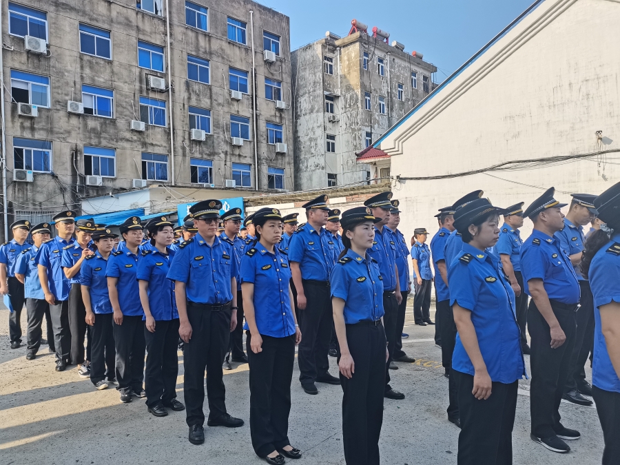 城管局的100余名干部职工齐聚办公楼院内,局党组成员、副局长杨跃宣布活动正式开始。三名执法队员踏着整齐划一的步伐,庄严护卫国旗至升旗台,鲜艳的五星红旗在雄壮的国歌声中徐徐升起迎风飘扬,干部职工原地肃立怀着崇高敬意向国旗庄严敬礼。