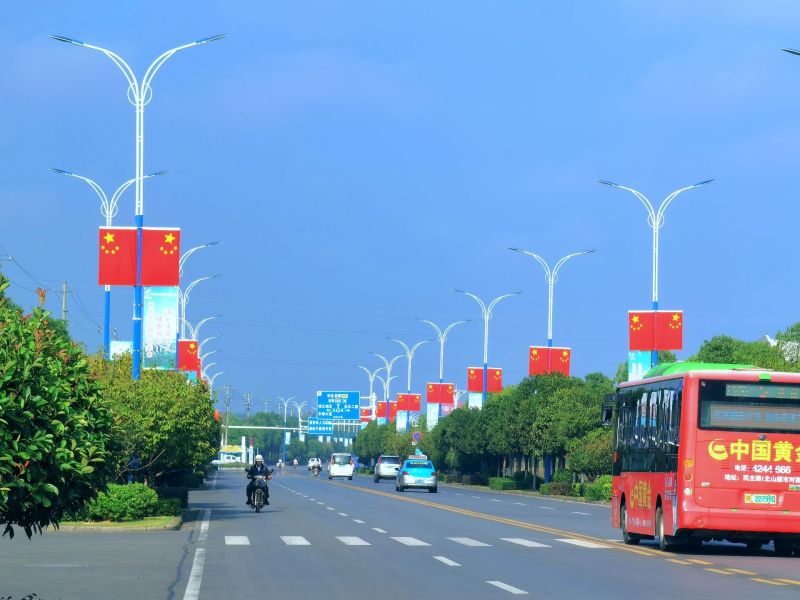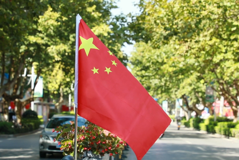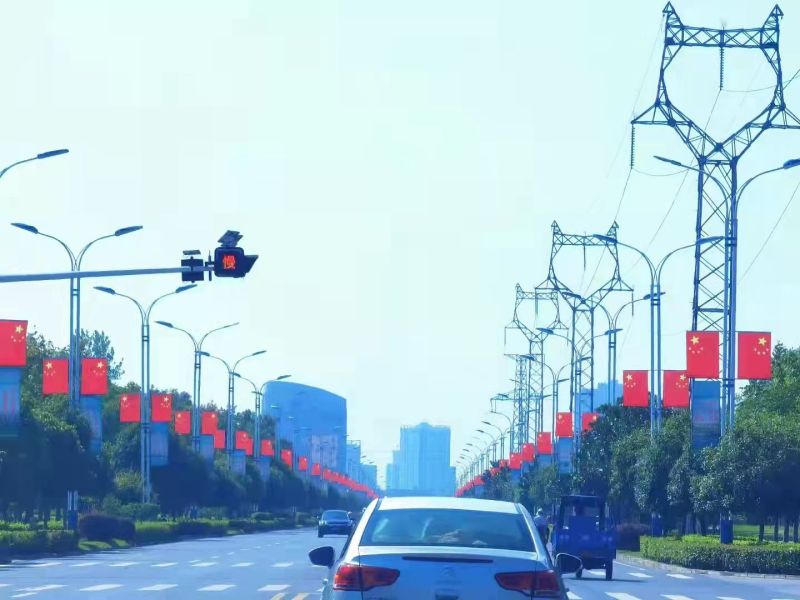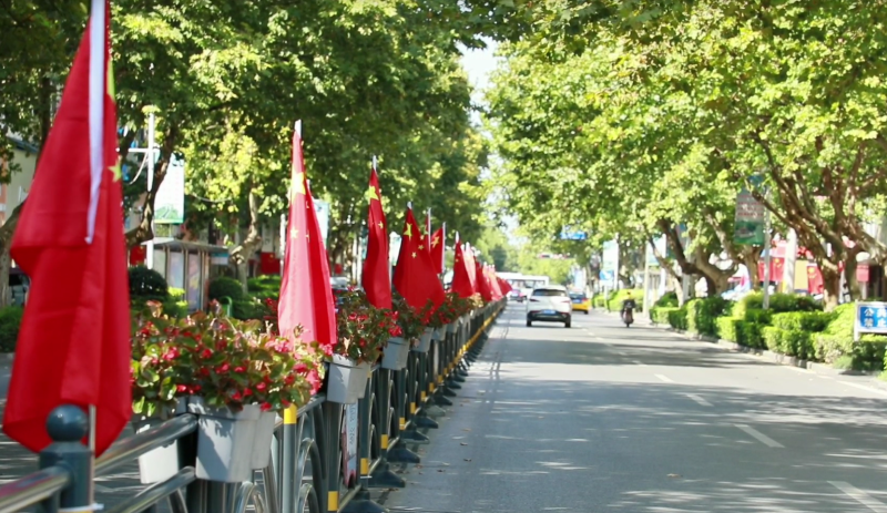 △民主大道、仙女大道、迎宾大道等主干道路两侧悬挂起了五星红旗。