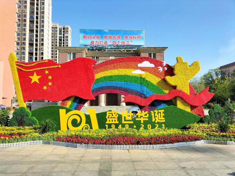 被精致的节日主题扎景、鲜红的国旗扮靓