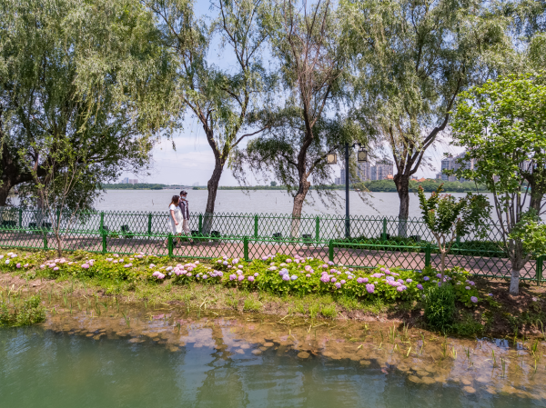 秋季,走进金银湖湿地公园,所见所视皆为绿色,只是这抹绿跟平日里看见的略有不同,多了一份灵动和清透,这份灵动清透源于盈盈水面的掩映生姿,源于鸟儿啼鸣、花团锦簇的绚丽生动,也源于居民朋友们的笑闹生趣。