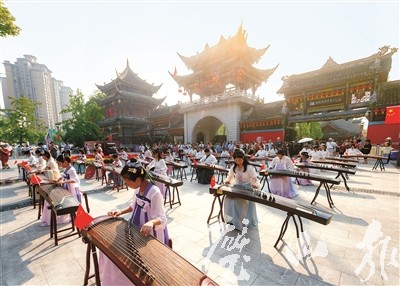 国庆期间,2021第十三届中国西部动漫文化节、秀湖首届国风文化旅游节、莲花穴·重庆乡村艺术市集、第三届重庆国际房车露营展览会等多项活动连台呈现,让节日的璧山人气爆棚、精彩不停。图为10月1日,秀湖非遗小镇,古筝爱好者现场演奏。