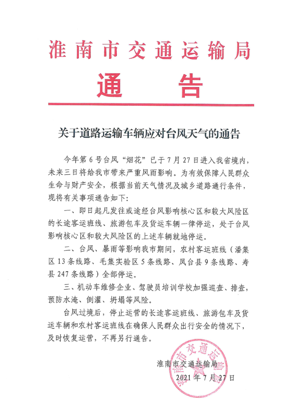 关于道路运输车辆应对台风天气的通告