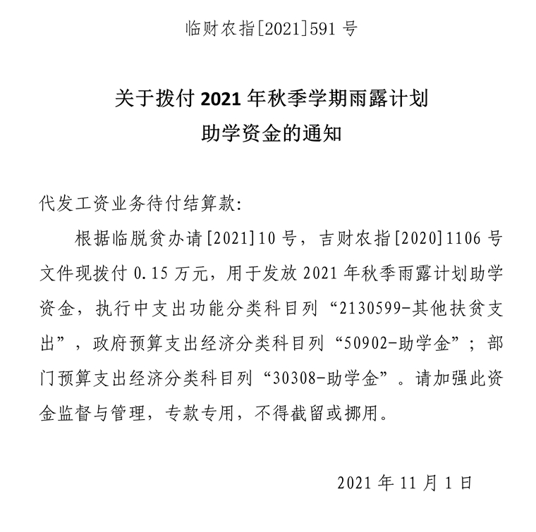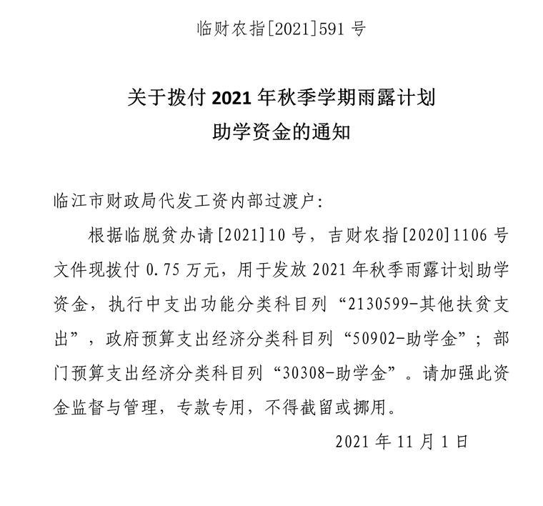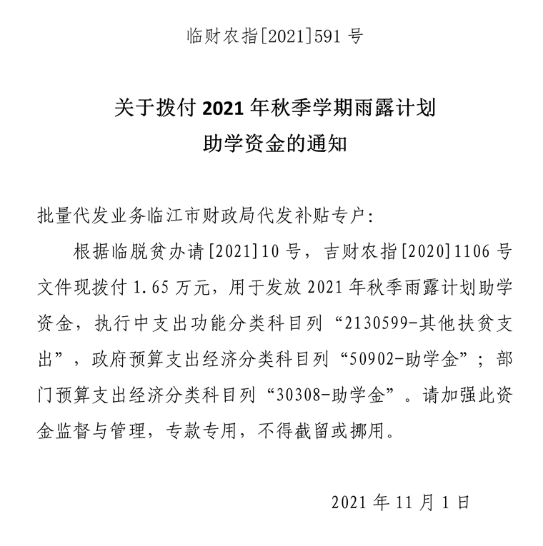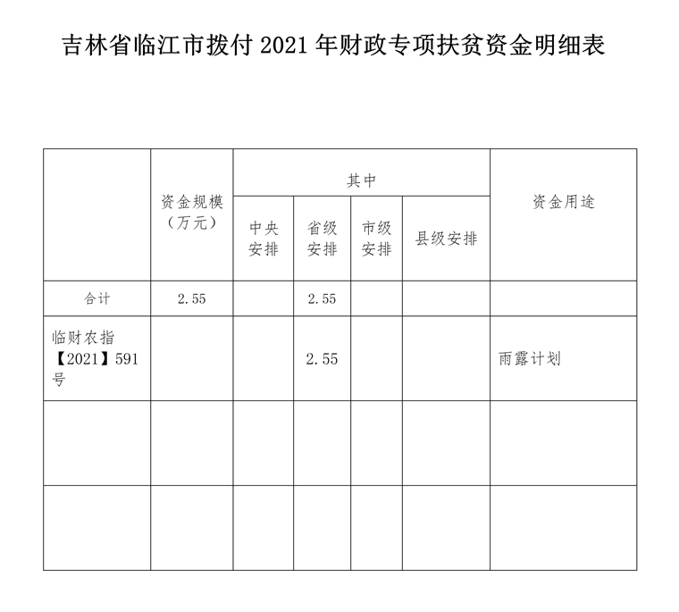 根据临江市脱贫攻坚领导小组2021年财政扶贫项目计划,现将吉林省临江市拨付2021年财政专项扶贫资金予以公告,公示期为10天(2021年11月3日至2021年11月12日)。如对结果有异议,请在公示期内向以下部门提出意见。