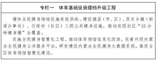 2.统筹建设全民健身场地设施。贯彻落实国务院办公厅《关于加强全民健身场地设施建设发展群众体育的意见》,推动各部门共同加大公共体育设施建设,持续提升公共体育设施供给水平。开展健身设施现状调查,制定健身设施建设补短板五年行动计划,实施全民健身公共设施补短板工程,优先规划建设贴近社区、方便可达的体育公园、全民健身中心(小型体育综合体)、公共体育场、社会足球场、健身步道、户外运动公共服务设施等项目建设,推动实现旗县(市、区)、苏木乡镇(街道办事处)、行政村(社区)三级公共健身设施和城市社区“15分钟健身圈”全覆盖。
